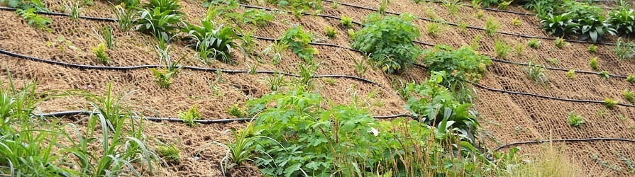 W ogrodach za pomocą geomat można zabezpieczać skarpy każdej wielkości. W przypadku nachyleń skarp do 50°, warunkowo także bardziej stromych, ale często w połączeniu z innymi technologiami. Najpopularniejsze są siatki i maty kokosowe, ponieważ łączą naturalne i estetyczne rozwiązanie, które wygląda dobrze także wtedy, gdy posadzone rośliny dopiero się rozrastają i nie pokryły jeszcze skarpy na całej powierzchni.